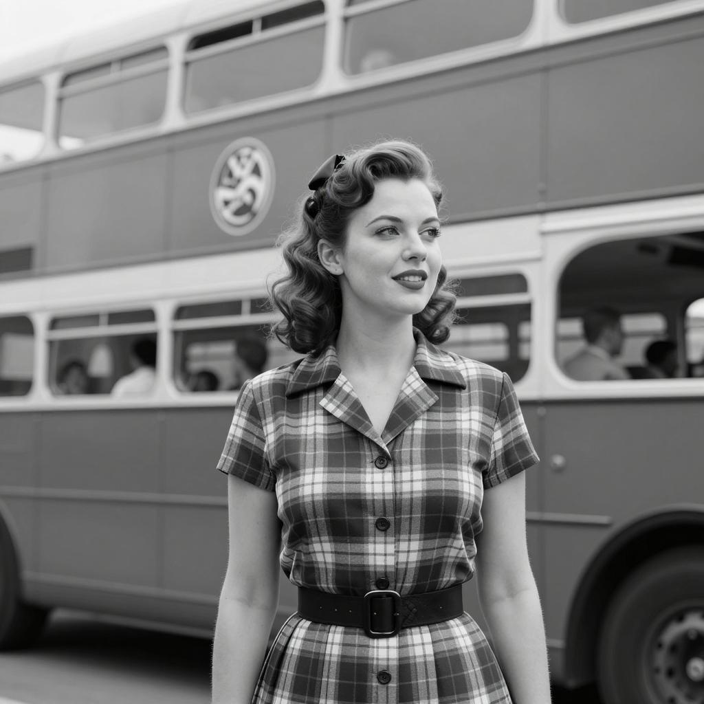 Black and white photograph of a 1940s-style woman with wavy hair wearing a plaid dress with a black belt. She stands in front of a double-decker bus with a round emblem on the side. The bus has windows with visible passengers. The woman looks to the right with a slight smile. The bus is slightly blurred in the background.