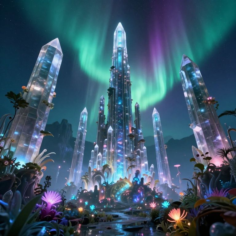 Imagine a captivating landscape where towering crystalline spires, reminiscent of fantastical structures found in dreamscapes, rise majestically into a swirling nebula-like sky. From an immersive first-person viewpoint, you are drawn along a path lined with luminescent moss that seems to guide your steps between these ethereal formations. As daylight transitions into twilight, the crystals emit an otherworldly glow, casting mesmerizing patterns on the ground and creating an atmosphere that is both serene and unsettling, piquing your curiosity about what lies beyond this surreal domain.