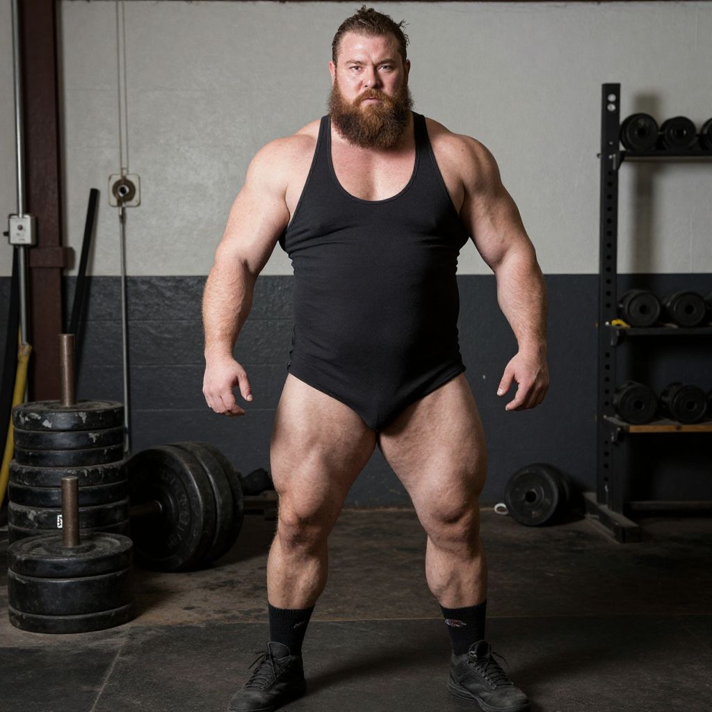 A muscular, heavily built man with a full beard stands in a workshop, surrounded by large weights and equipment, exuding strength and power.