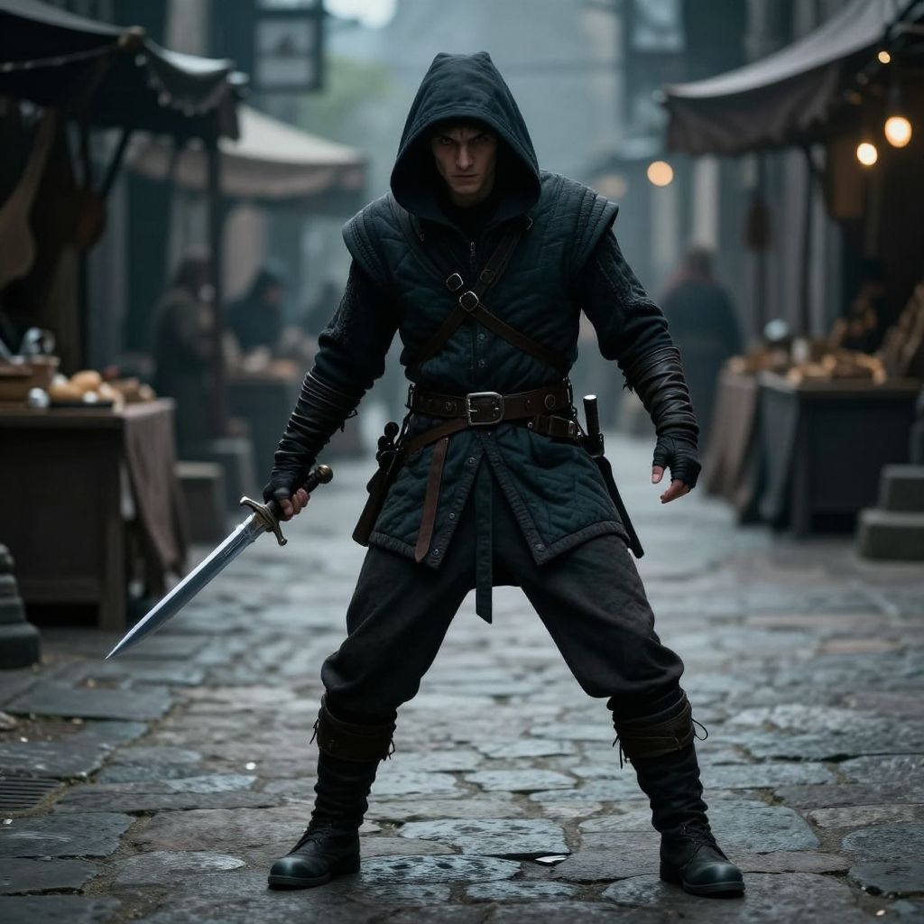 Photograph of a hooded, black-cloaked figure walking down a foggy, medieval street with stone buildings and lanterns, surrounded by dim