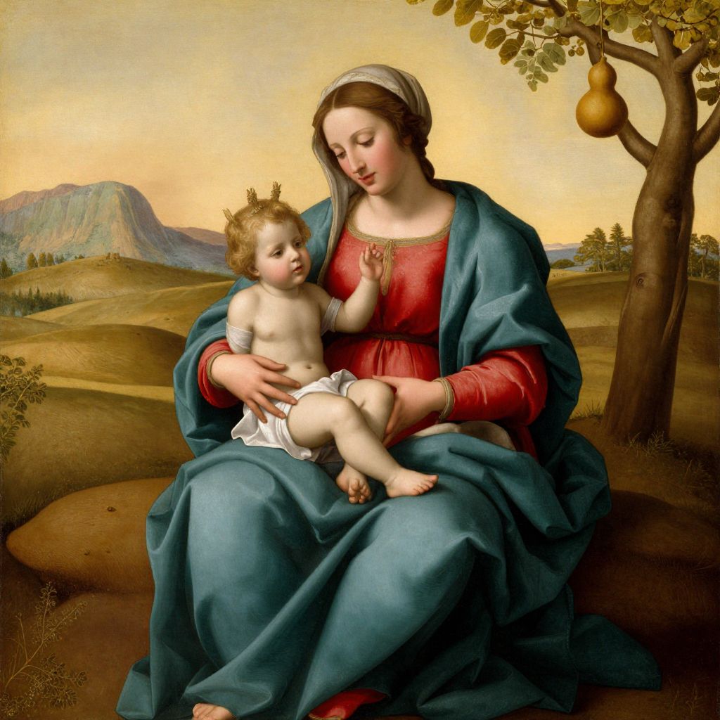 Seated Madonna cradles the Christ Child on her lap, draped in vibrant red and teal robes, set against a serene landscape with rolling hills, distant mountains, and a solitary tree bearing a small gourd, all bathed in soft golden light.