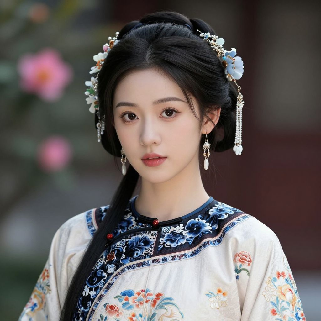 Mei lin lee costume, 1girl, solo, chinese clothes, earrings, black hair, jewelry, hair ornament, looking at viewer, blurry background, blurry, flower, realistic, dress, hair flower