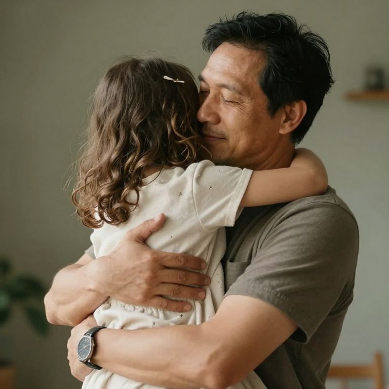 Photograph of a middle-aged man with short, dark hair, wearing a gray t-shirt, hugging a young girl with wavy brown hair, dressed in a white shirt. The man's eyes are closed, and he is smiling softly as he embraces the girl from the side. His right hand is on her back, while his left hand is around her waist. The background is softly blurred, featuring a light-colored wall and a small wooden shelf. The image exudes warmth and tenderness. The man's skin is light, and the girl's hair has a slight sheen.