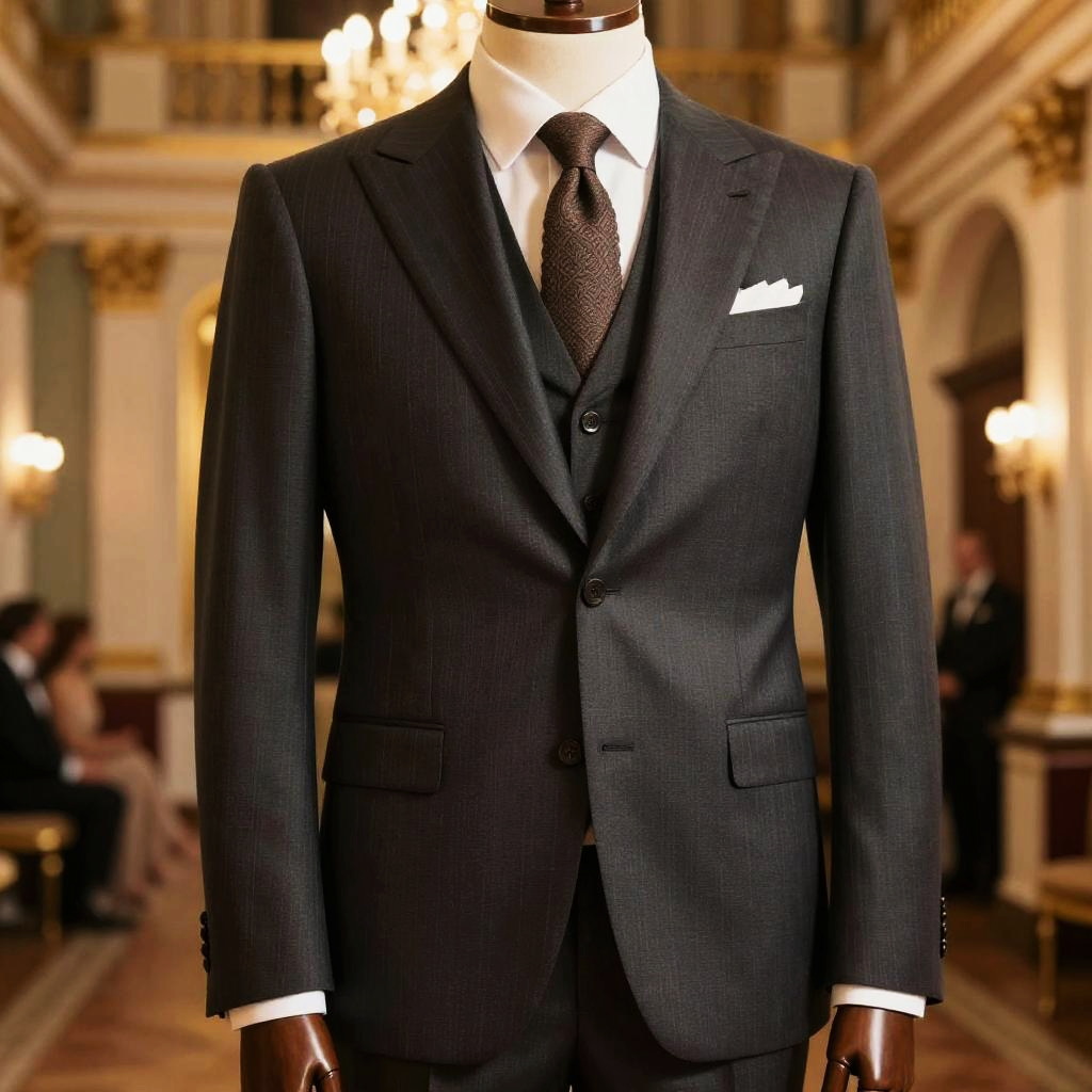 Costard, timeless formal suit ensemble with subtle pinstripes worn during a formal event in a grand hall, luxurious lighting with golden hues, intricate details on buttons and fabric, ultra realistic and cinematic ambiance