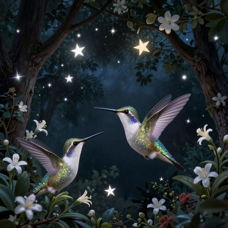 Magical night scene with two iridescent hummingbirds, glowing starry sky, and white flowers amidst dark, enchanted forest. Digital art.