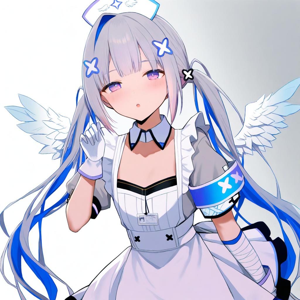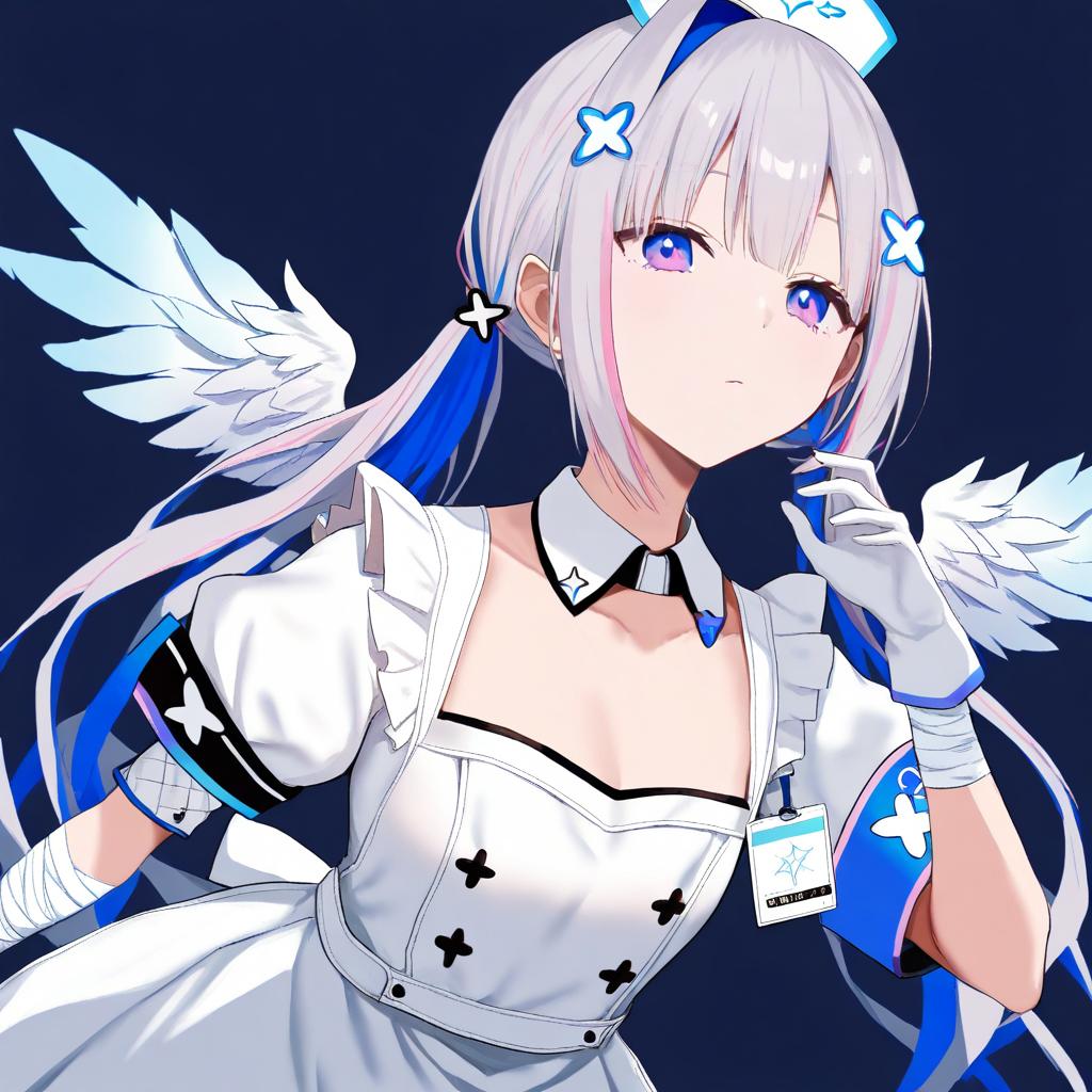 Amane kanata (nurse), hololive, 1girl, angel wings, angel wings, purple eyes, blue hair, grey hair, colored inner hair, single hair intake, official alternate hairstyle, streaked hair, official alternate hair length, long hair, pink hair, x hair ornament, twintails, blunt bangs, small breasts, flat chest, nurse cap, white gloves, white dress, white apron, detached collar, puffy short sleeves, virtual youtuber, virtual youtuber, feathered wings, feathered wings, nurse, nurse, bandaged arm, id card, armband, by artist gomu (chewinggom), animagine