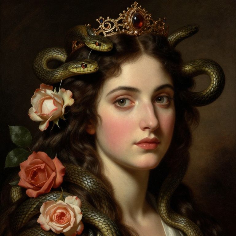 Albert Bierstadt beautiful realistic madusa face with snake hair a tiara and some roses throught the snakes,
