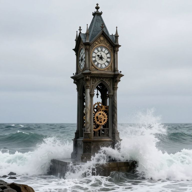 Gothic-inspired clock tower stands defiantly at the edge of the ocean, its ornate structure partially submerged as relentless waves crash against its base, revealing intricate gears within its open archway.
