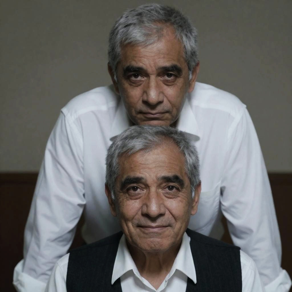 Two middle-aged men with grey hair, wearing white and black shirts. Background is blurred. The man in the back leans forward with a serious expression, while the man in front smiles. Both have wrinkled faces. The man in front wears a black vest. Lighting is dim.