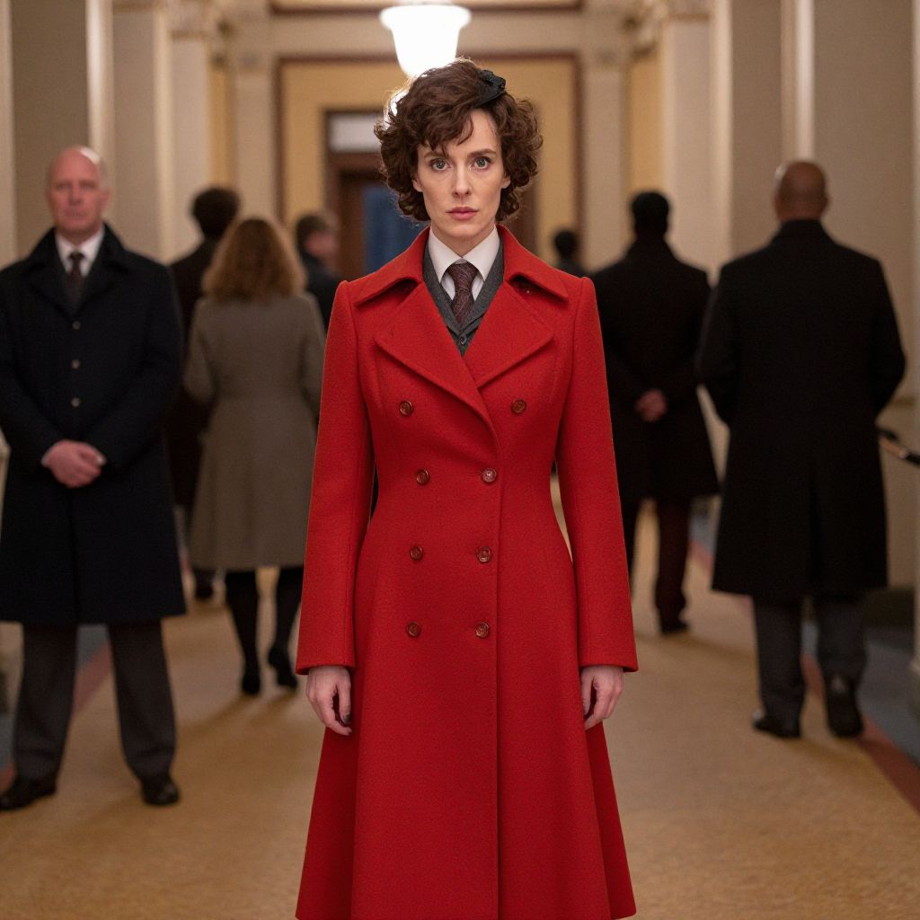 Photograph of a woman in a vibrant red double-breasted coat, standing confidently in a well-lit, elegant hallway with blurred, formally dressed on