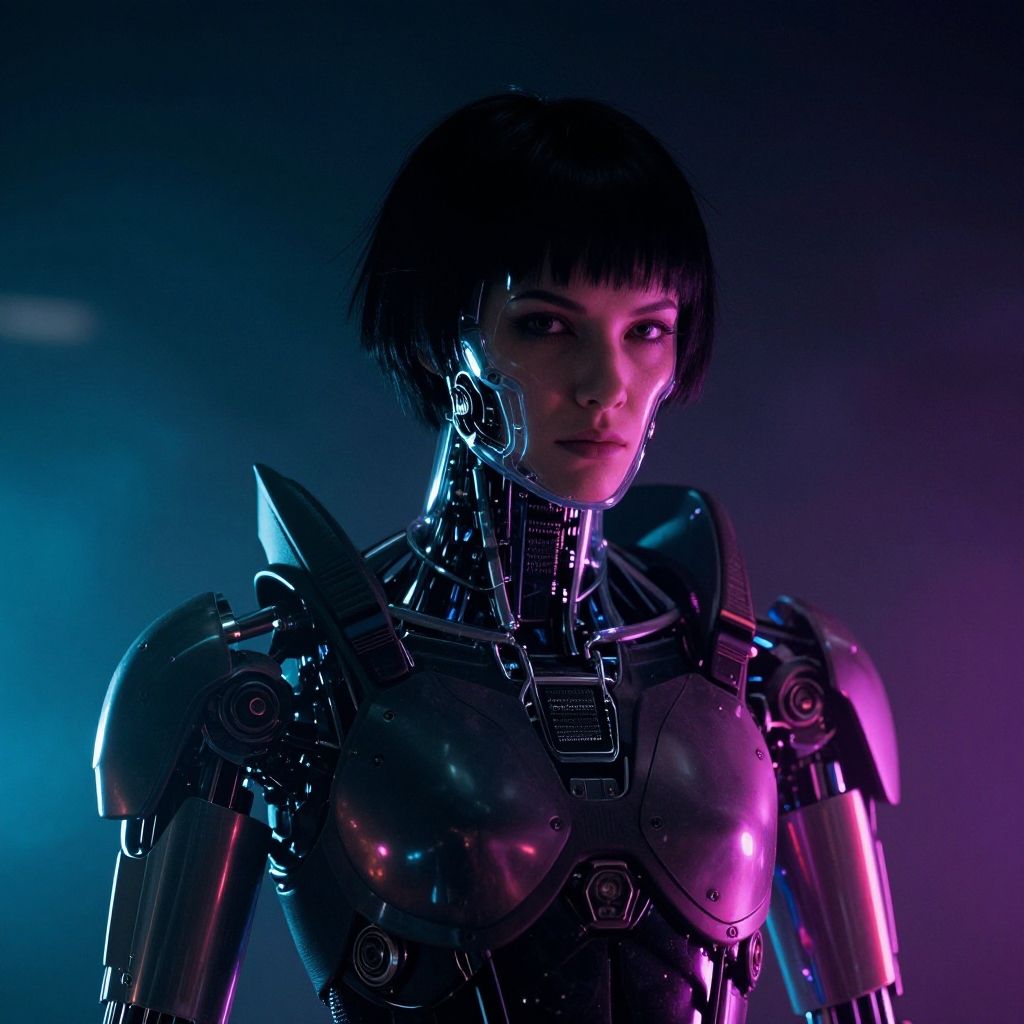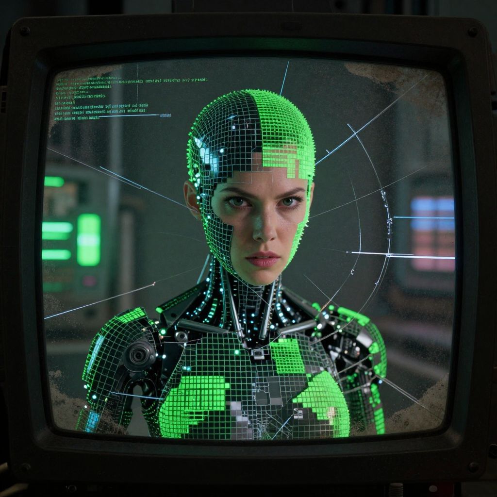 Digital artwork of a cybernetic woman with green and black grid-patterned suit, viewed through a cracked, vintage TV screen.