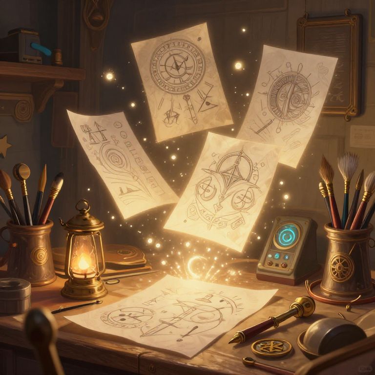 Create mode in a fantasy studio, enchanted tools emitting magical light, glowing sketches floating mid-air, cozy yet mystical atmosphere, ancient runes combined with advanced technology, intricate details, warm and inviting color palette, digital painting style