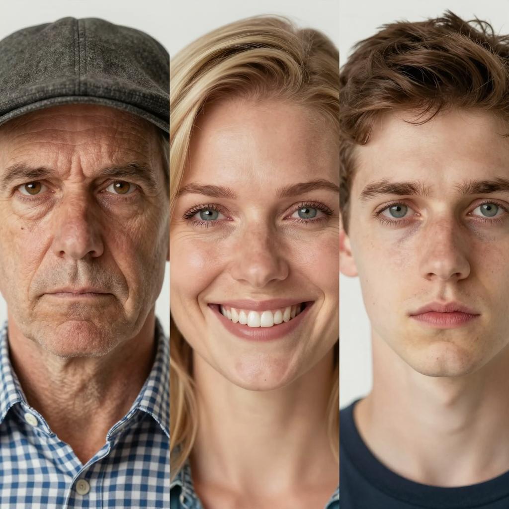 Portrait of a red-haired Caucasian woman with an angry expression, screaming with clenched fists, wearing a white tank top. She is flanked by two older Caucasian men with serious expressions, both clenched fists, standing in a dimly lit indoor setting.