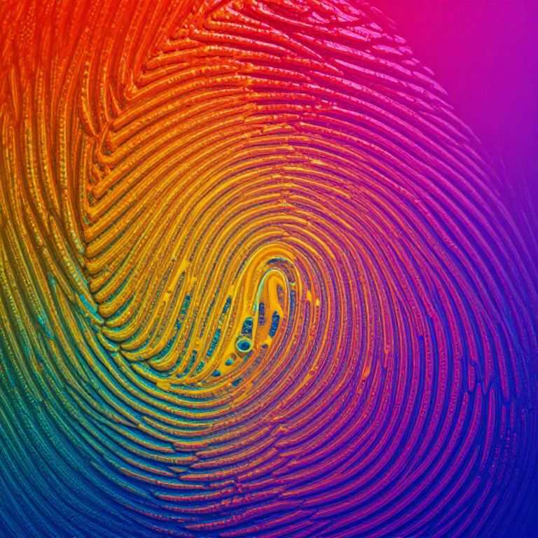 Finger print texture abstract art, swirling ridge patterns in vibrant colors, smooth gradient with high contrast lighting, detailed and sharp skin texture, futuristic digital art style