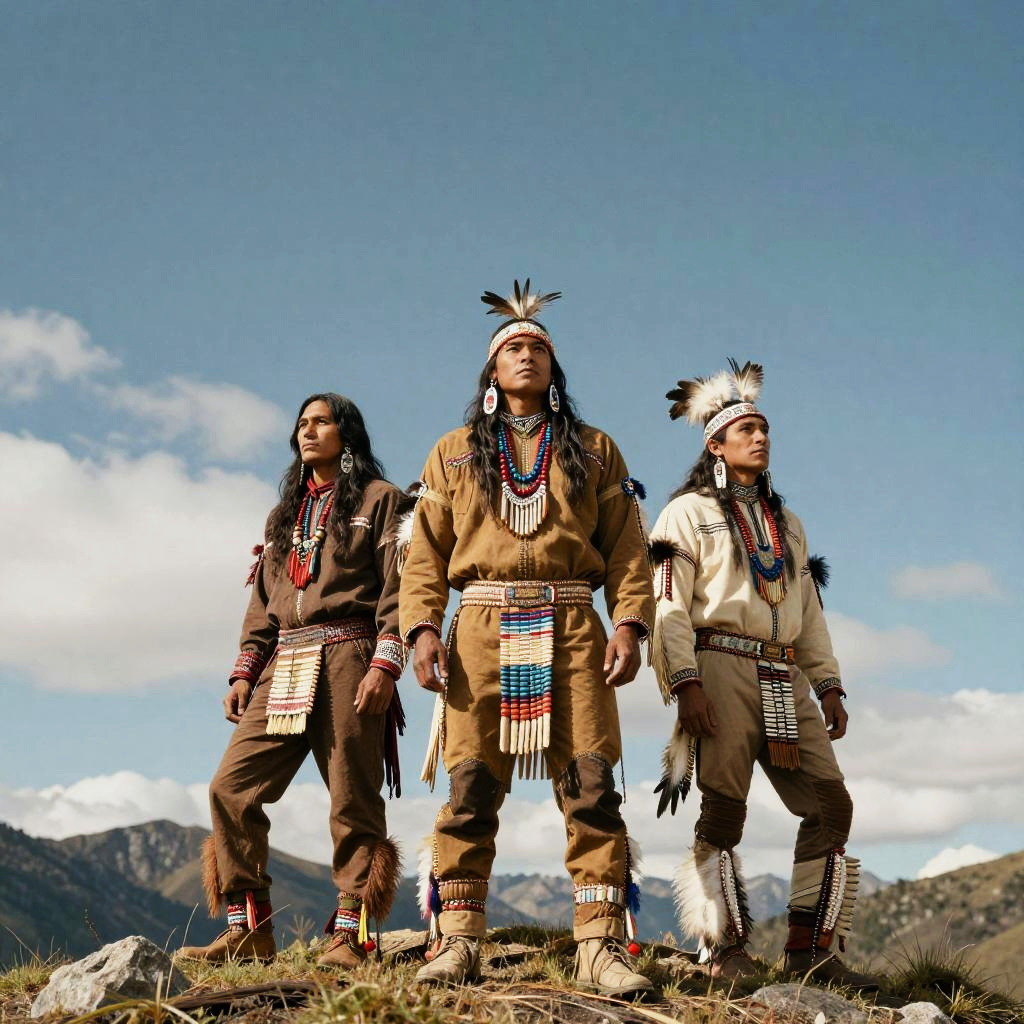 Native American male models with long hair standing atop a mountain ridge with wide expansive skies behind them, dressed in traditional ceremonial regalia with feathers and beads, majestic and powerful atmosphere, vibrant colors, ultra-detailed, cinematic realism.
