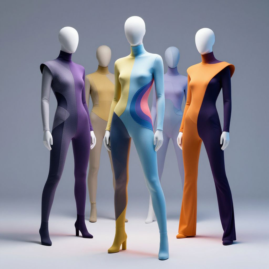 AI clothing models showcasing futuristic fashion in a sleek, minimalist studio environment, emphasizing high-tech textures and seamless fabric designs, vibrant colors with dynamic lighting highlighting the fusion of technology and style.