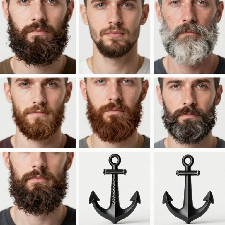Photograph collage of nine close-up headshots of bearded men with varying beard styles and colors, arranged in a 3x3 grid. The top row features one man with a full black beard, another with a short brown beard, and a third with a long white beard. The middle row shows two men with full brown beards and one with a short grey beard. The bottom row has two men with dark brown beards and one with a grey beard. Below the bearded men are two black anchor symbols, each with a circular loop at the top. The white background emphasizes the facial features and beards.