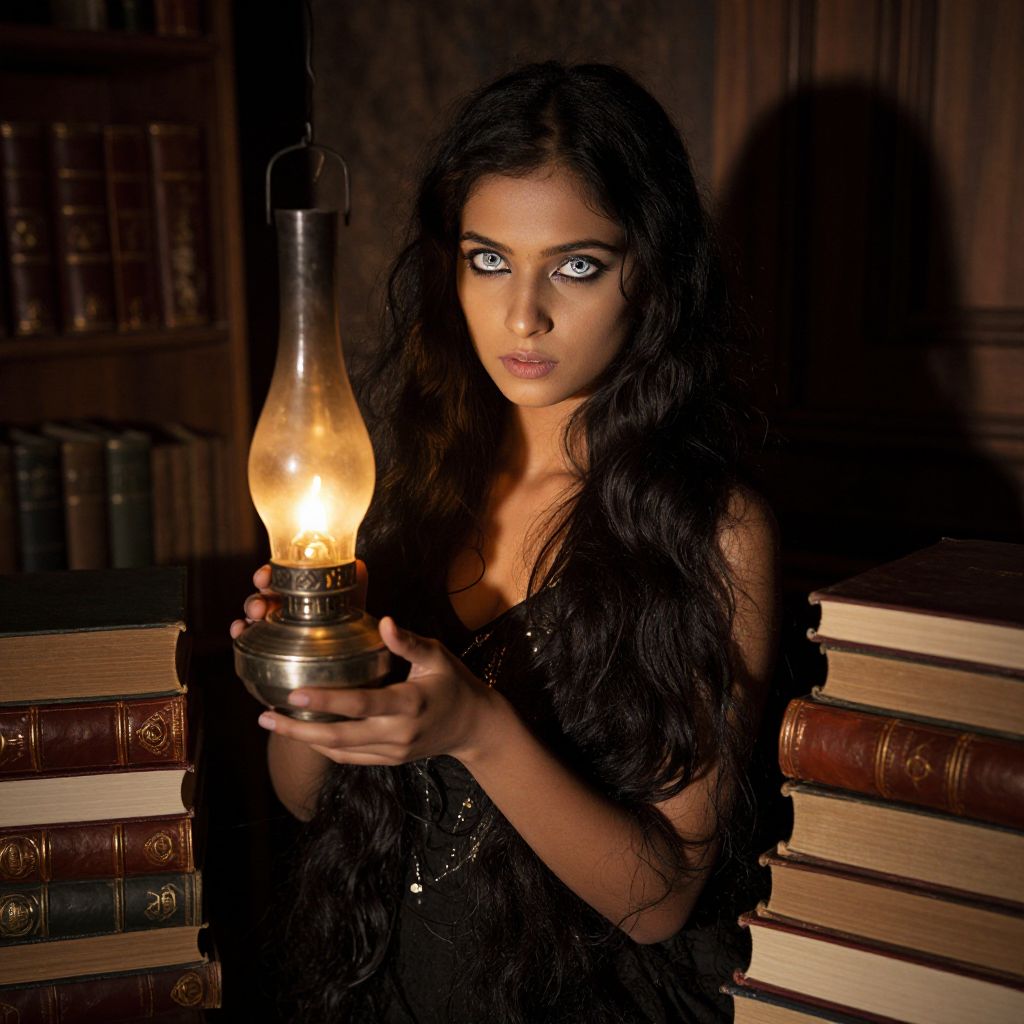 An enigmatic South Asian woman emerges from the shadows, her porcelain skin and silver eyes illuminated by an antique oil lamp's golden glow. Her raven-black hair cascades down to her waist as she stands amidst a dimly lit Victorian study filled with antiquarian books and leather-bound journals. The warm light casts dancing shadows across her delicate features, creating an intriguing interplay of illumination and darkness. With an air of vulnerability and intrigue, her gaze meets the camera's, capturing secrets untold and stories waiting to be revealed.