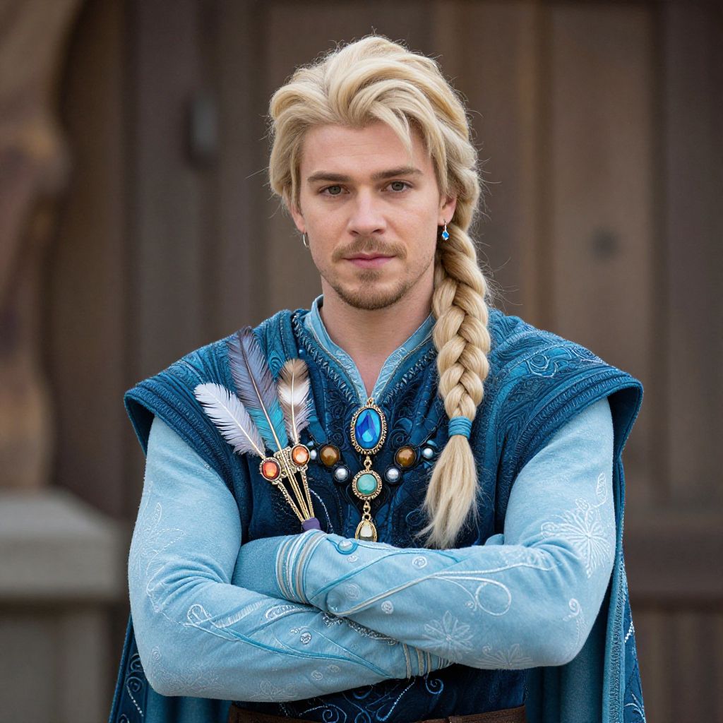 Frozen kristoff costume, solo, 1boy, braid, blonde hair, male focus, gloves, feathers, jewelry, cape, facial hair, earrings, single braid