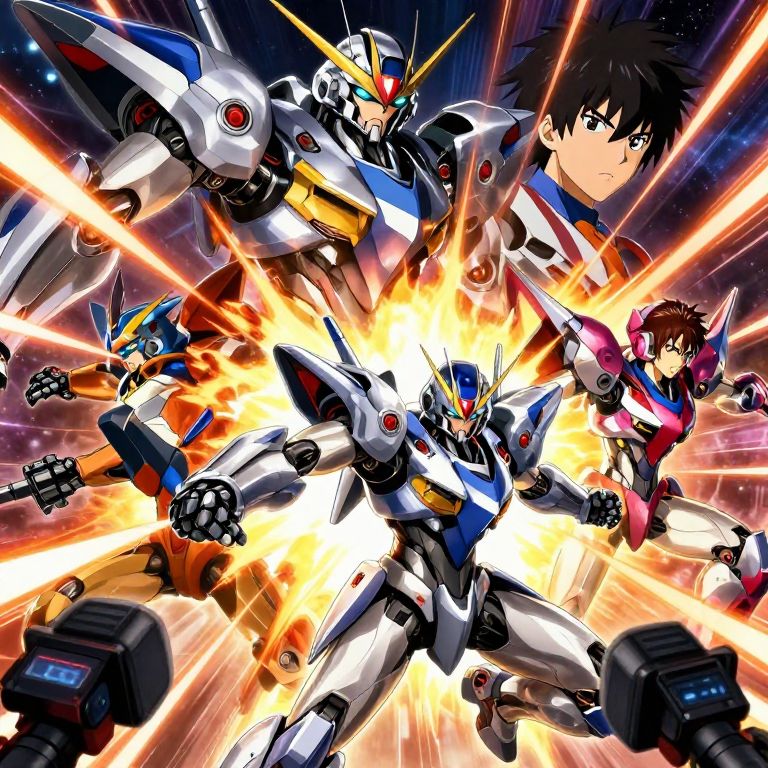 Anime AI images showcasing a high-tech battle scene with robotic warriors, explosive energy effects, intricate mechanical designs with anime-style sleekness, intense emotion on faces, dramatic lighting and dynamic camera angles.