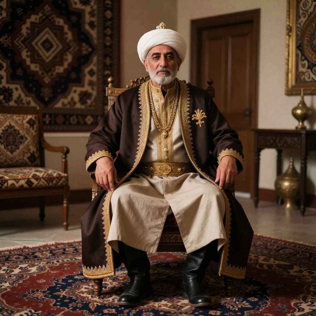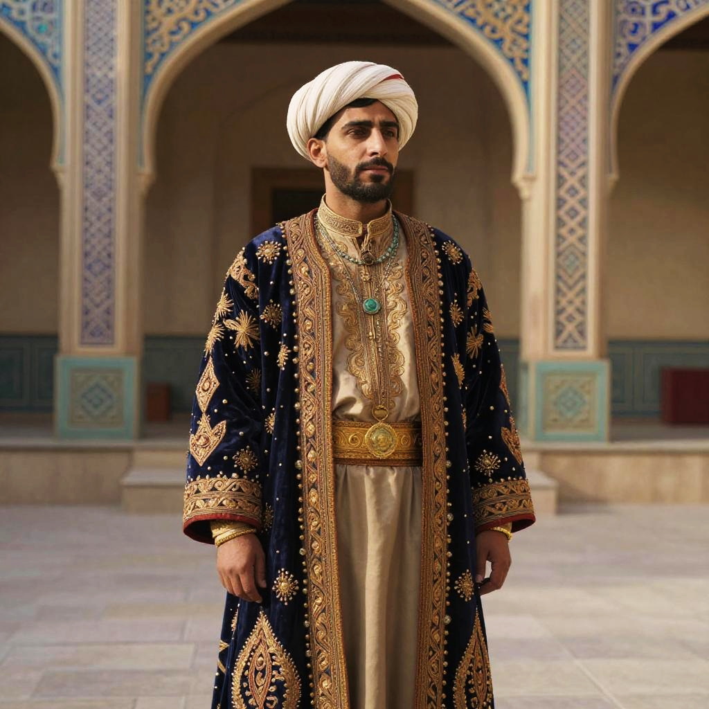 Qajar clothing depicted on a noble Persian man in an opulent royal courtyard, intricate patterns and rich fabrics glowing under soft golden light, detailed embroidery and traditional turbans, 19th century Persian art style, vibrant colors and textures
