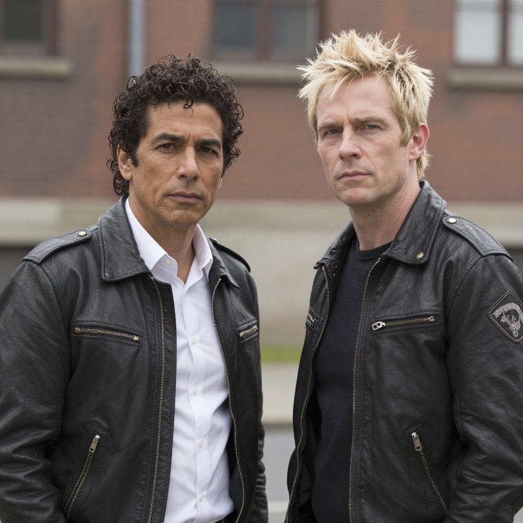 Photograph of two men standing side by side outdoors. The man on the left has dark curly hair, olive skin, and wears a black leather jacket over a white shirt. The man on the right has spiky blonde hair, fair skin, and wears a black leather jacket with a patch on the sleeve. Both have serious expressions. A brick building with windows is in the blurred background.