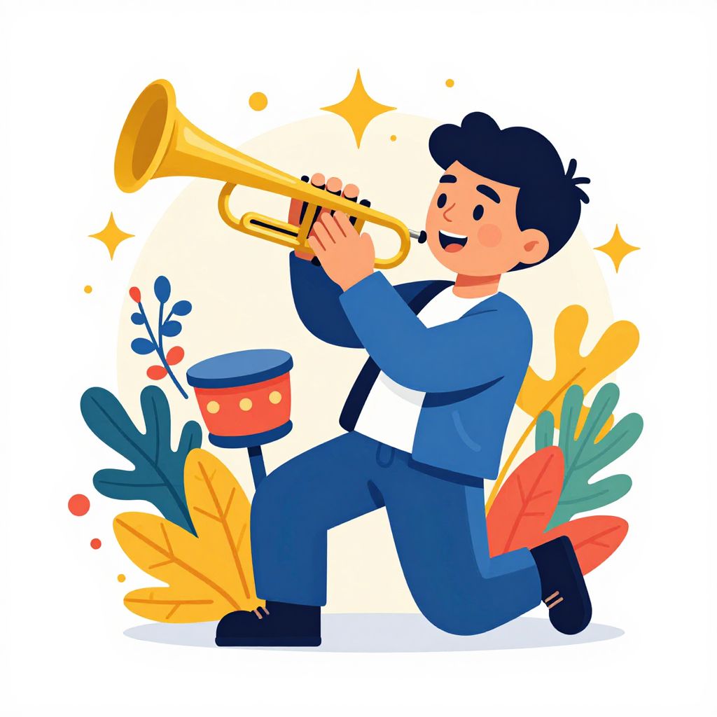 Colorful vector illustration of a cheerful boy playing a golden trumpet. The boy has black hair and is dressed in a blue jacket, blue pants, white shirt, and black shoes. The scene includes vibrant abstract leaves and a snare drum in the background, creating a fun and kid-friendly musical theme.