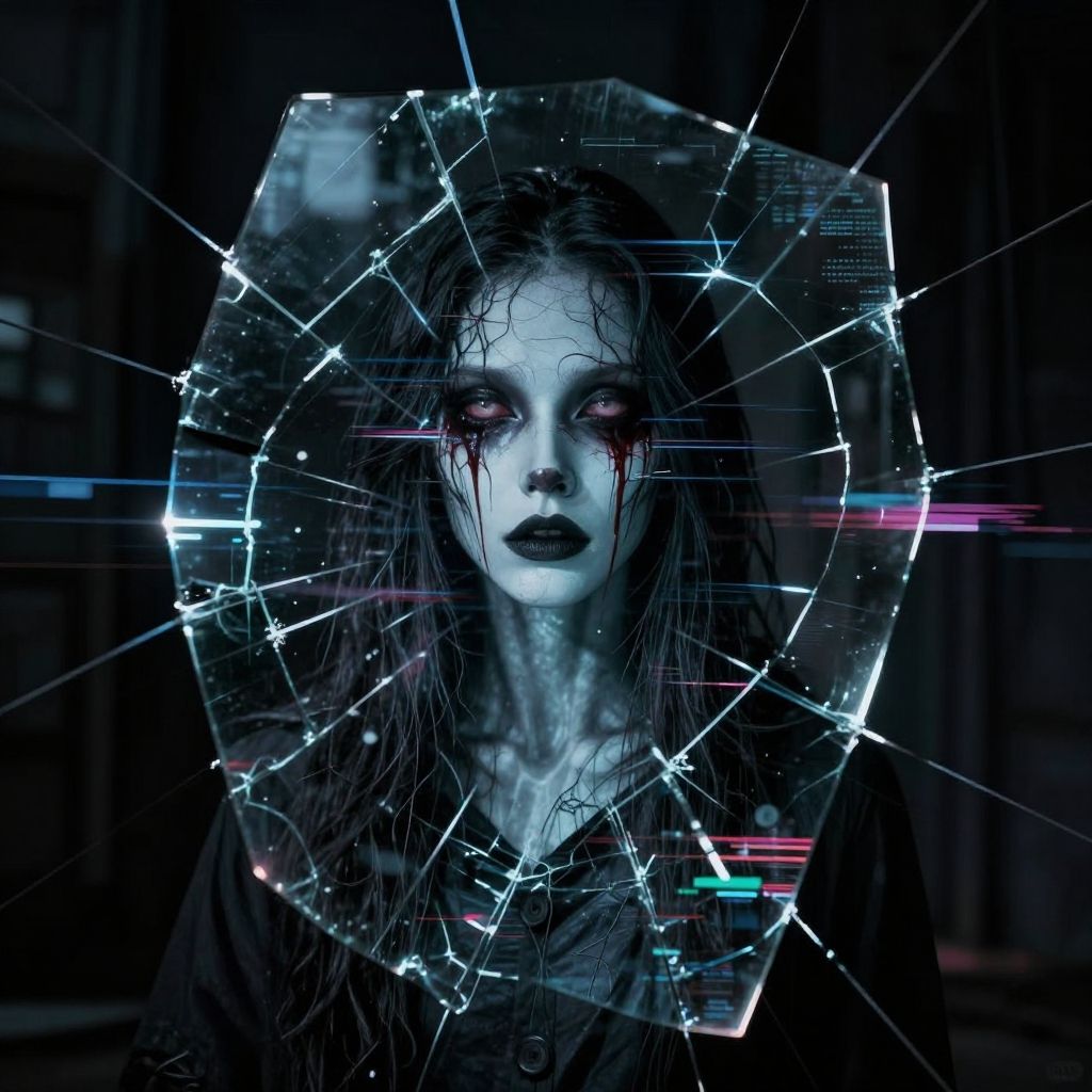 Digital art of a pale, blue-faced woman with dark, wet hair, surrounded by a shattered glass frame with neon lines.