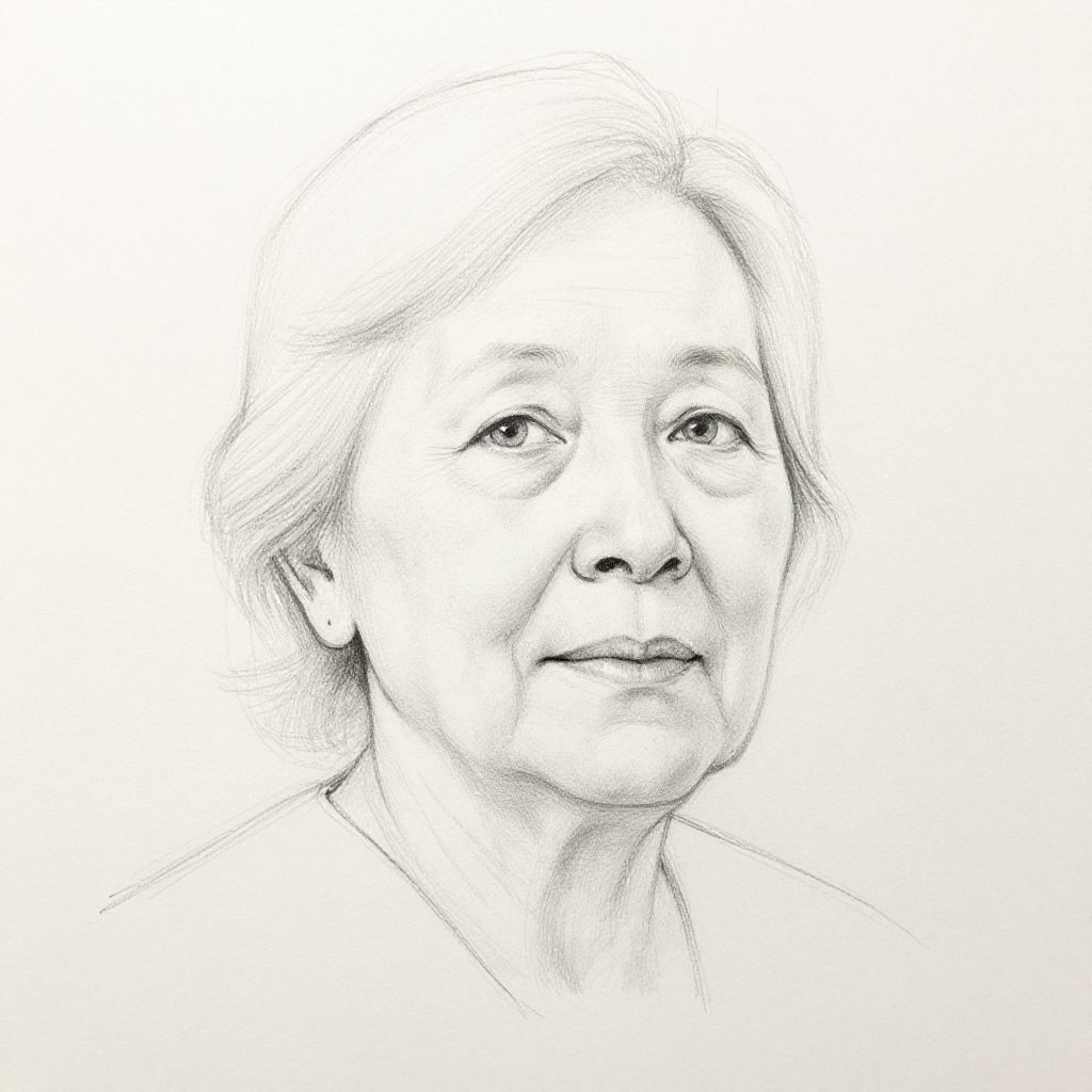 Photo to sketch outline conversion of a portrait of an elderly woman, focusing on expressive facial lines and subtle wrinkles, rendered with soft graphite pencils to create a lifelike yet simplistic visual style.