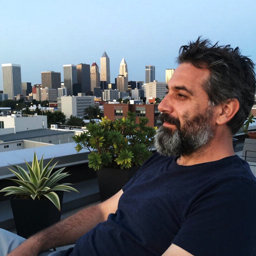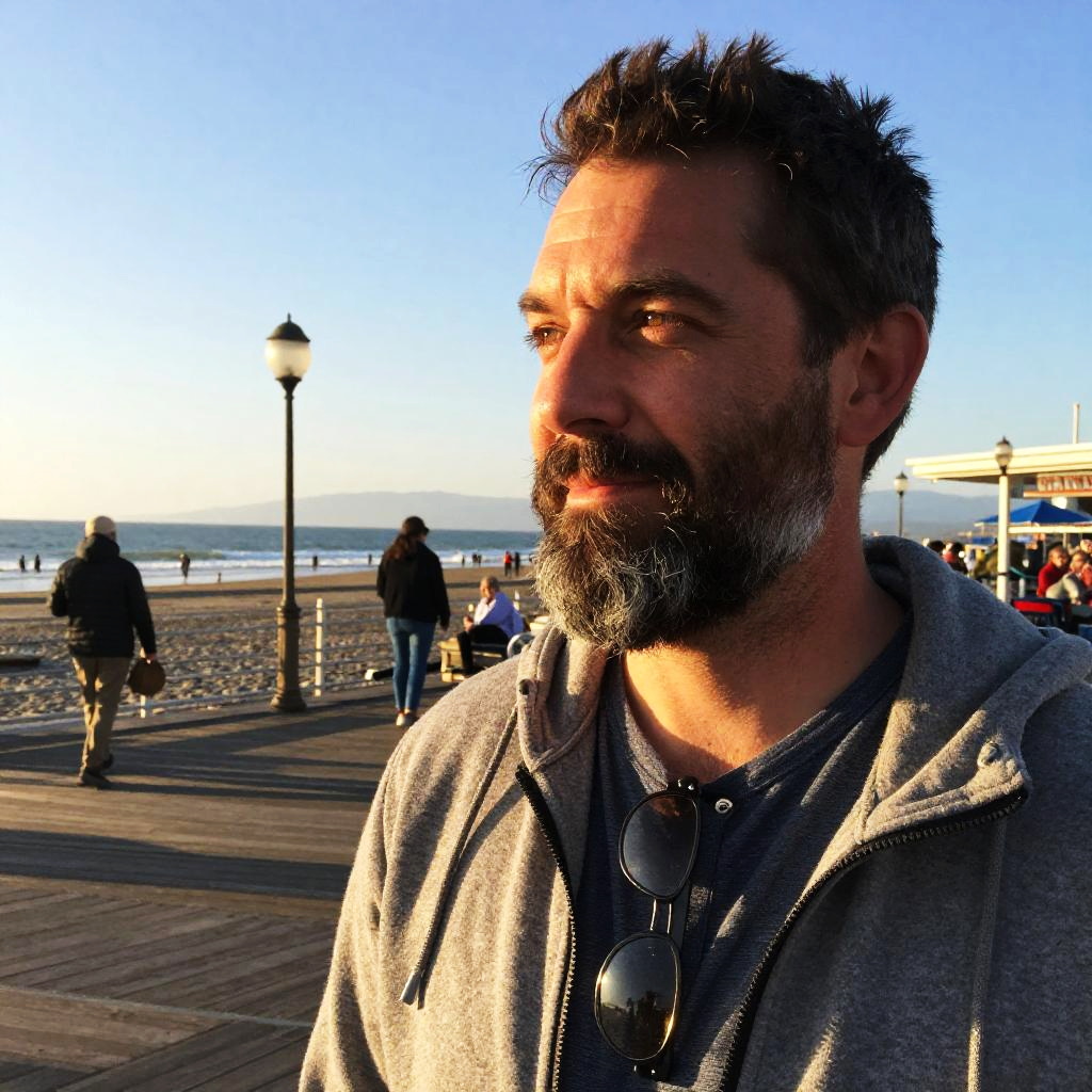 Candid portrait of a man with a salt and pepper beard and mustache, wearing a grey shirt, standing in a historic library interior. Warm lamplight softly illuminates the wooden bookshelves filled with old books in the background. The man has a relaxed demeanor and light-colored eyes.