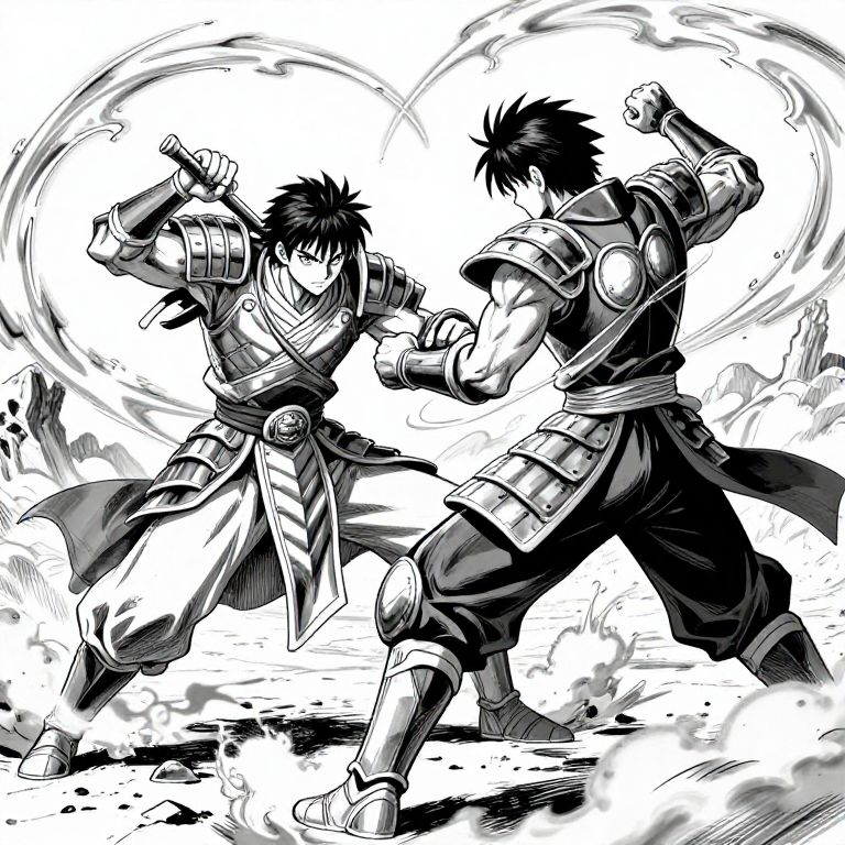 Black and white anime art portraying an intense battle between two warriors in a barren wasteland, dynamic poses captured with fluid line art, detailed armor and weapon designs with dramatic shading, swirling dust clouds and energy effects accentuating motion, high contrast and emotionally charged scene.