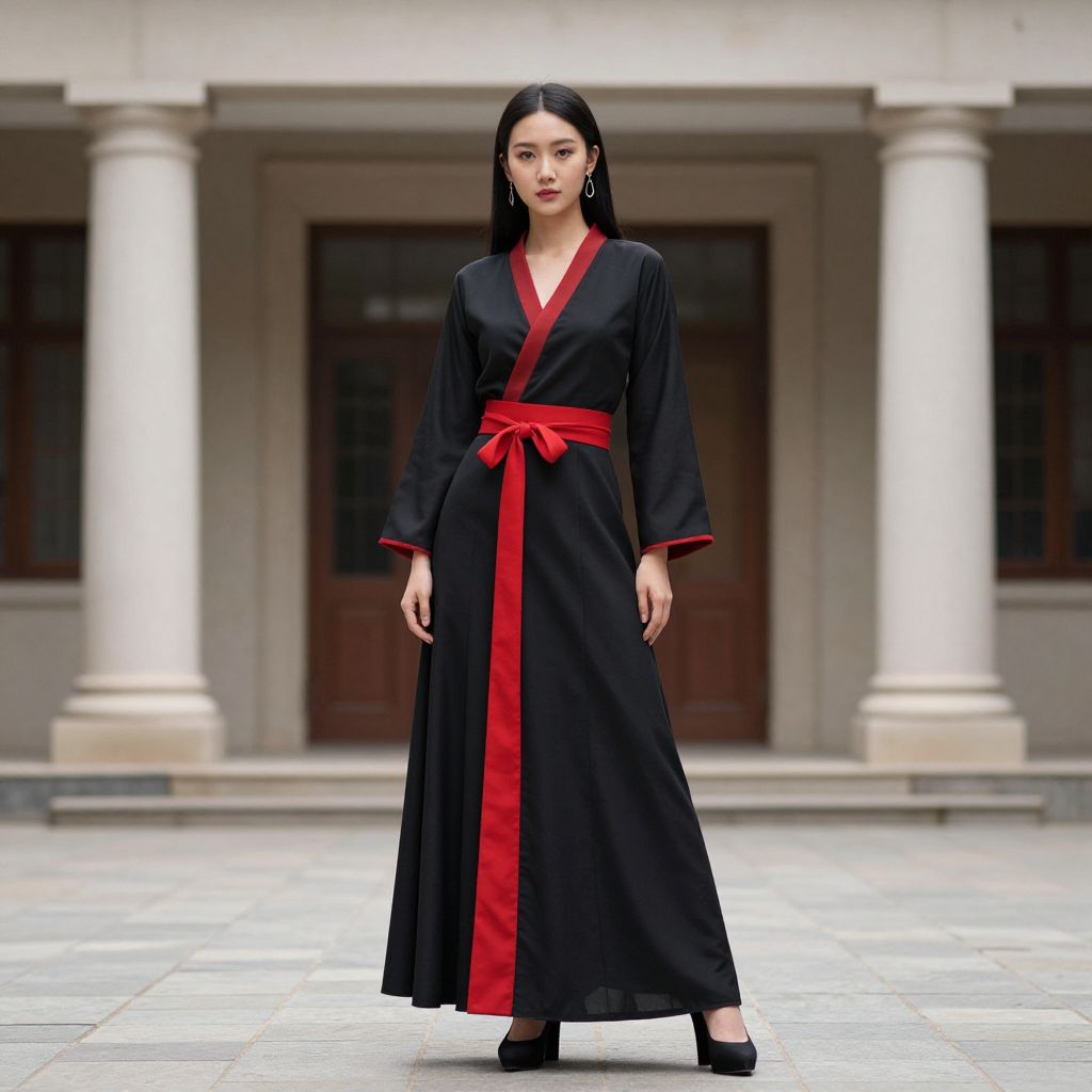 Photograph of an Asian woman with straight black hair, wearing a long black robe with red trim and a red belt, standing in front of a classical building with white columns and brown doors. She has a fair skin tone, red lipstick, and black high-heeled shoes. Her expression is neutral, and she stands confidently in the center of the image. The background is slightly blurred, emphasizing her as the focal point. The image has a sharp, high-contrast style with bright natural light.