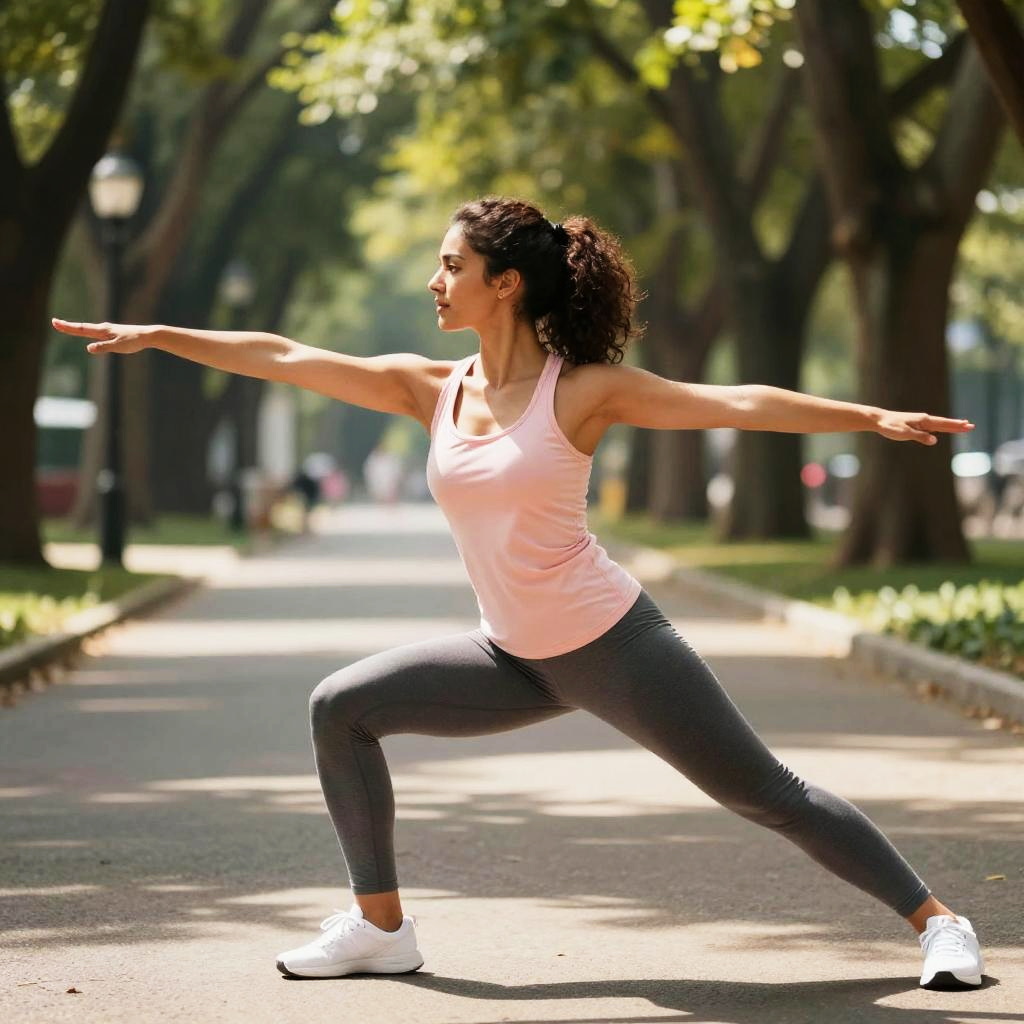 Photograph of a fit, young woman with light brown skin and curly dark hair in a ponytail, doing a side lunge in a sunlit park. She's wearing a pink tank top, gray leggings, and white sneakers. She's stretching her left arm forward and her right arm back, her face focused. Sunlight filters through the trees in the background, casting dappled shadows on the ground.
