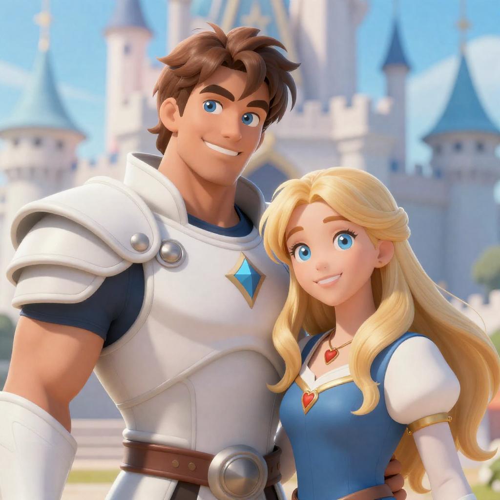 Digital animation of a romantic scene. Man with brown hair and brown cloak, woman with long blonde hair and white dress, standing close, gazing at each other. Full moon in night sky, stars, and clouds in background. Silhouettes of trees frame the scene. Man's hand on woman's waist. Gentle, loving expressions.