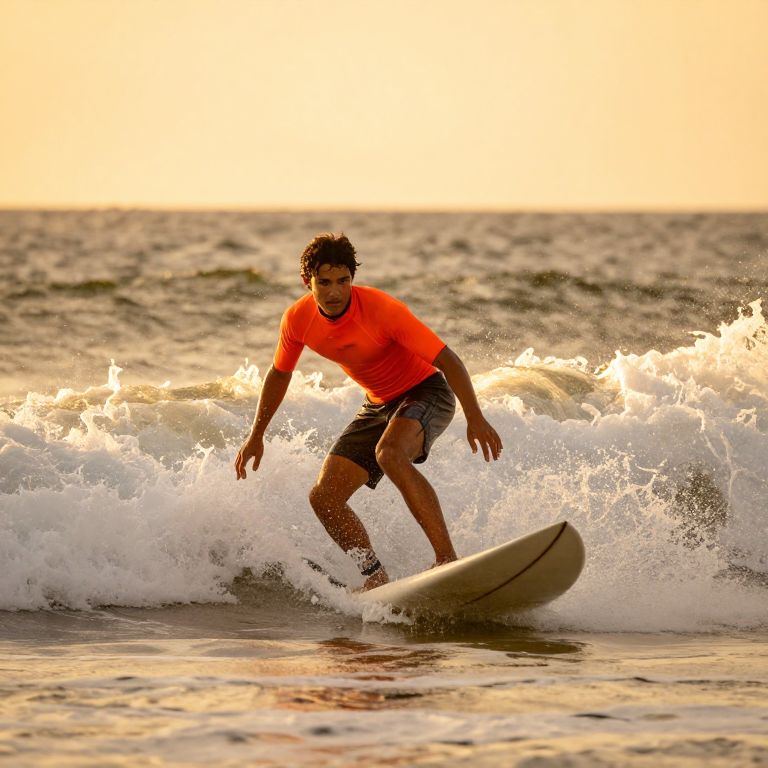 A young male surfer in his late 20s with a tanned, weathered face and intense focus, wearing a bright orange wetsuit and a board short, riding a massive golden-hued wave on a secluded beach at sunset, the ocean crashing behind him with foam spraying into the sky, golden sand and warm lighting creating a dramatic natural backdrop.