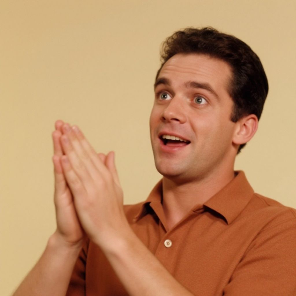 Vibrant Anscocrome photograph of a man enthusiastically clapping his hands together, radiating joy and energy, set against a warm beige background, soft focus, shallow depth of field, retro film aesthetic, Kodak Portra 160, rich saturated tones, nostalgic 1960s vibe, nostalgic charm. Man has masculine face and piercing eyes