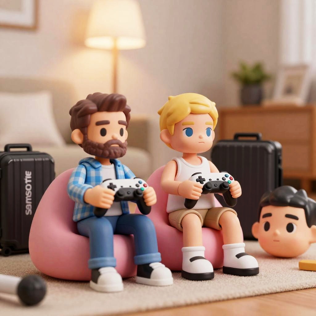 Photograph of two detailed, life-sized toy figurines sitting on a pink beanbag in a living room. Both figurines hold game controllers, looking concentrated. The figure on the left has a brown beard and wears a blue plaid shirt and jeans. The figure on the right has blond hair, wears a white tank top and beige shorts. Surrounding them are several "Samsonite" boxes. A large, inflatable head rests on the floor to the right. Warm light from a hanging lamp illuminates the room.