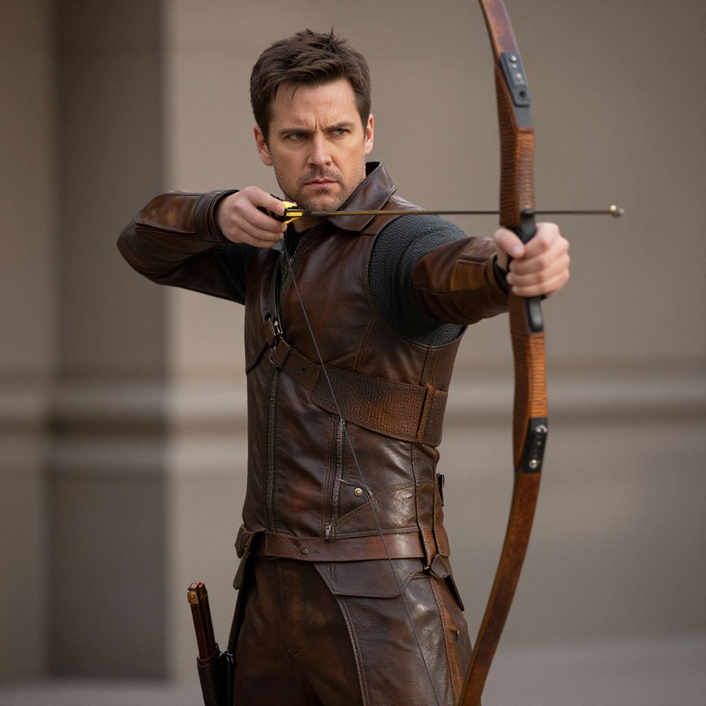 Photograph of a serious, dark-haired man in brown leather archer gear, drawing a wooden bow with arrow, urban background.