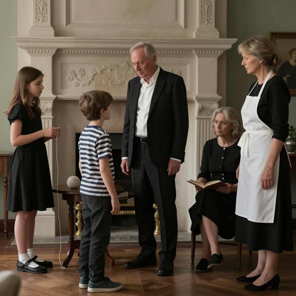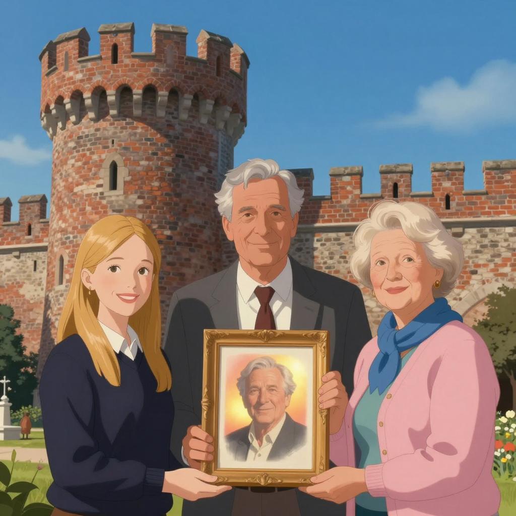 Digital illustration of a castle with a tall brick tower and crenelated roof. Three people stand in front: a smiling blonde girl in a dark sweater, an older man with gray hair in a gray suit, and an older woman with short blonde hair wearing a blue scarf and pink cardigan. A framed portrait with a warm glow is between the man and woman. The background shows a deep blue sky. The man and woman are standing with their hands on the frame. The illustration style is colorful and realistic.
