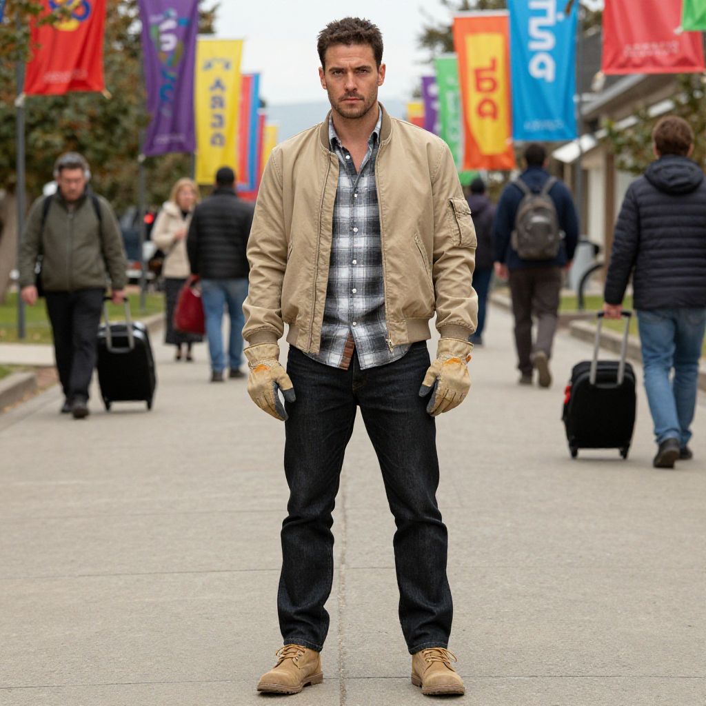 A man, khaki bomber jacket, grey flannel shirt, black denim jeans, tan suede desert boots, heavy-duty work gloves, concrete pathways, colorful banners fluttering, passengers with luggage in hand, ib technicolor film stock, confident expression. Man has masculine face and piercing eyes