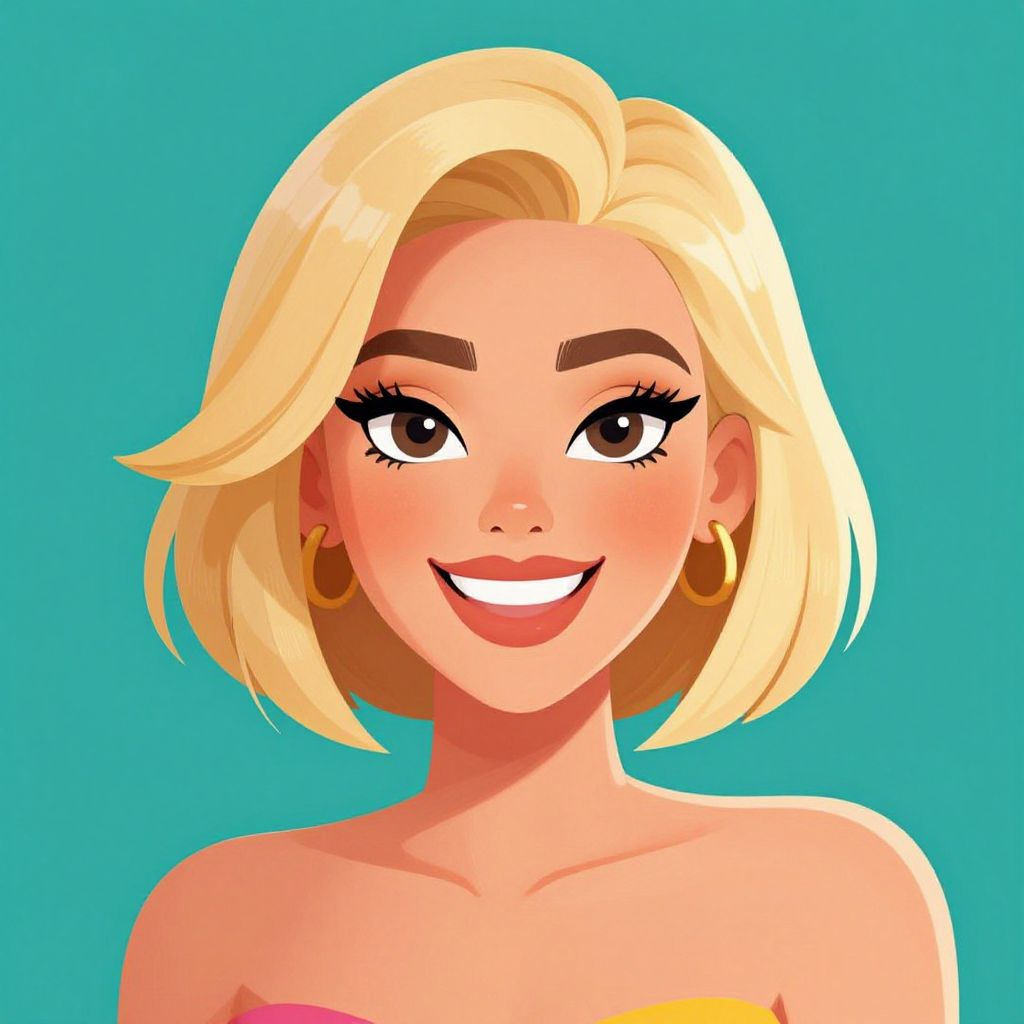 A vibrant digital illustration featuring a cheerful portrait of a woman with short blonde hair, bold makeup, and a radiant smile, rendered in a cartoonish style with smooth gradients and soft lighting against a teal background.