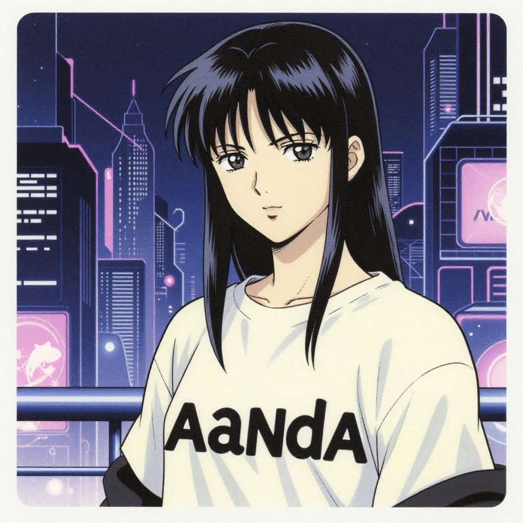 Digital anime-style drawing of a young woman with long black hair and fair skin, wearing a white T-shirt with "AANDA" in bold black letters. She has large, expressive eyes and a slight smile. The background features a neon-lit cityscape with tall skyscrapers and glowing signs, predominantly in shades of blue, purple, and pink. The woman stands in the foreground, slightly to the left, with a futuristic railing behind her. The image has a clean, modern aesthetic with sharp lines and vibrant colors.