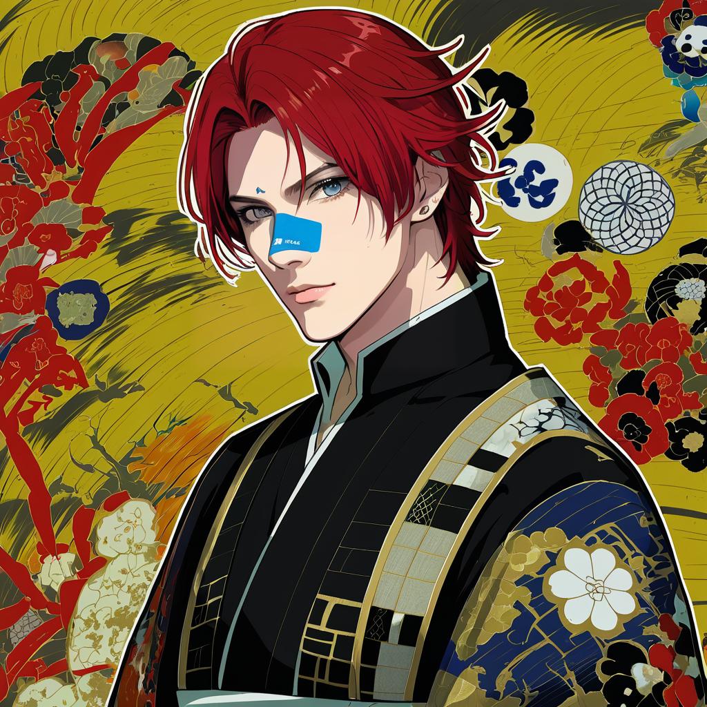Aizen kunitoshi, touken ranbu, 1boy, yellow eyes, red hair, bandaid on nose, tantou, by artist mishima hiroji, anime