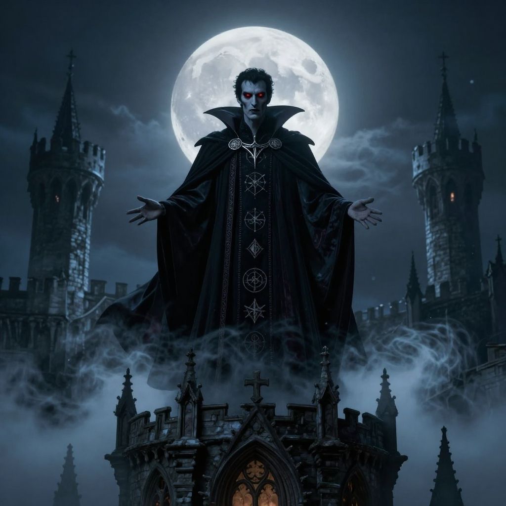 Vampire overlord standing atop a gothic castle at night, crimson eyes glowing, wearing a dark regal cloak adorned with ancient symbols, mist swirling around his feet, eerie full moon background