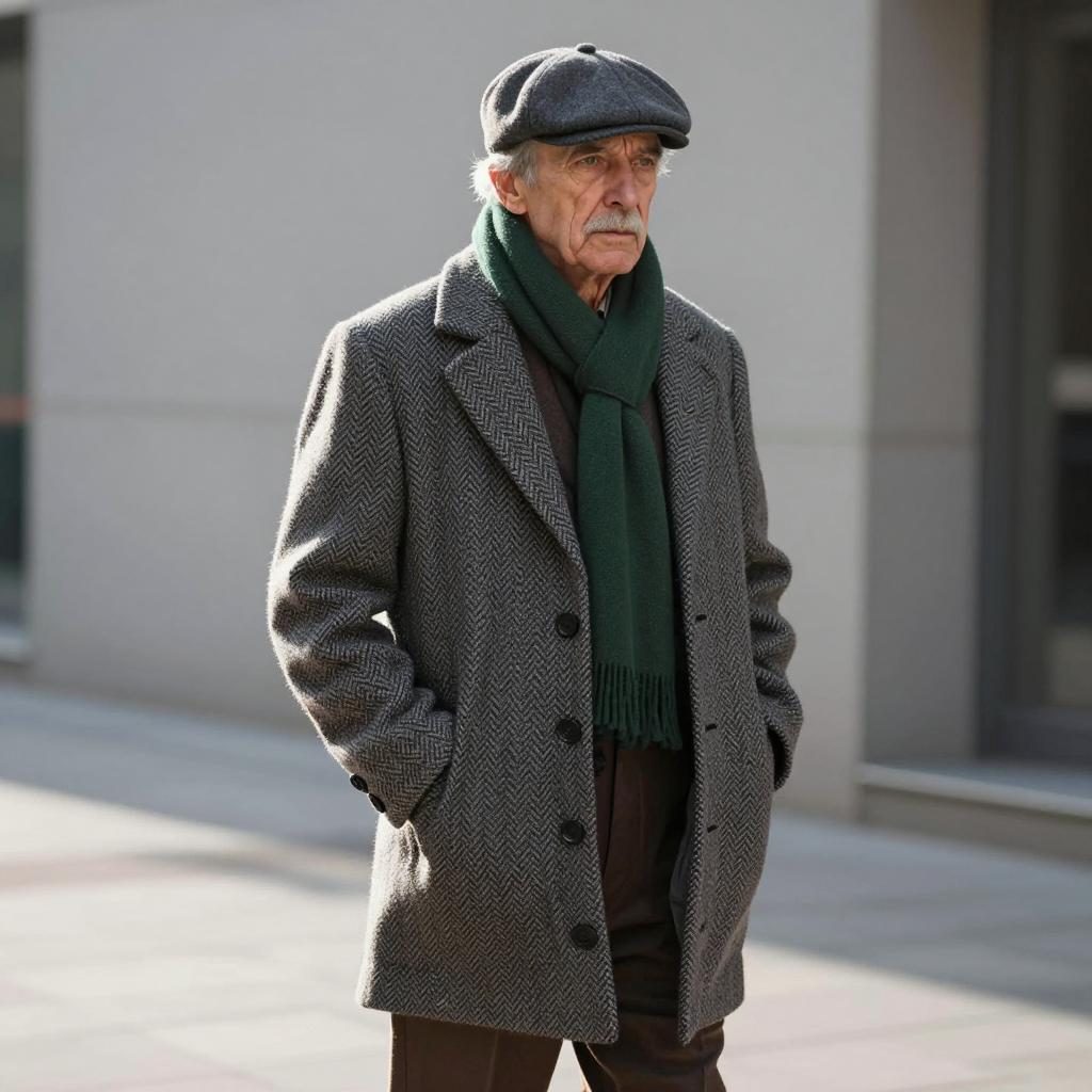 Mrs doubtfire fancy dress, photograph of an older man, standing, medium close-up, outdoor, daytime, sunlight, short gray hair, wearing black-framed glasses, brown suit jacket, white dress shirt, black pants, brown belt, hands in pockets, serious expression, neutral background, blurred brick wall, natural light, realistic, casual attire, business formal, mid-length hair, slightly windswept hair, slight smile, medium build, Caucasian, mature appearance