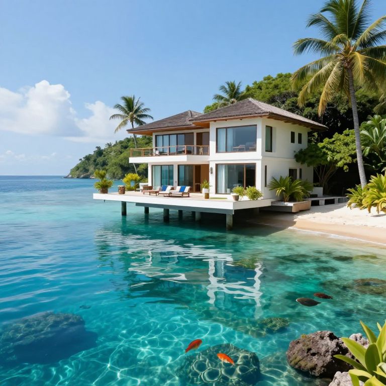Photograph of a modern, white, two-story beach house with large glass windows and a dark brown roof, elevated on stilts over clear, turquoise ocean water. The house has a balcony with outdoor furniture and potted plants. Palm trees and lush greenery surround the house, which is situated on a sandy shore with a few rocks in the foreground. Bright blue sky with scattered clouds and a calm sea with visible coral and orange fish near the bottom right. The scene exudes a tropical, luxurious, and serene atmosphere.