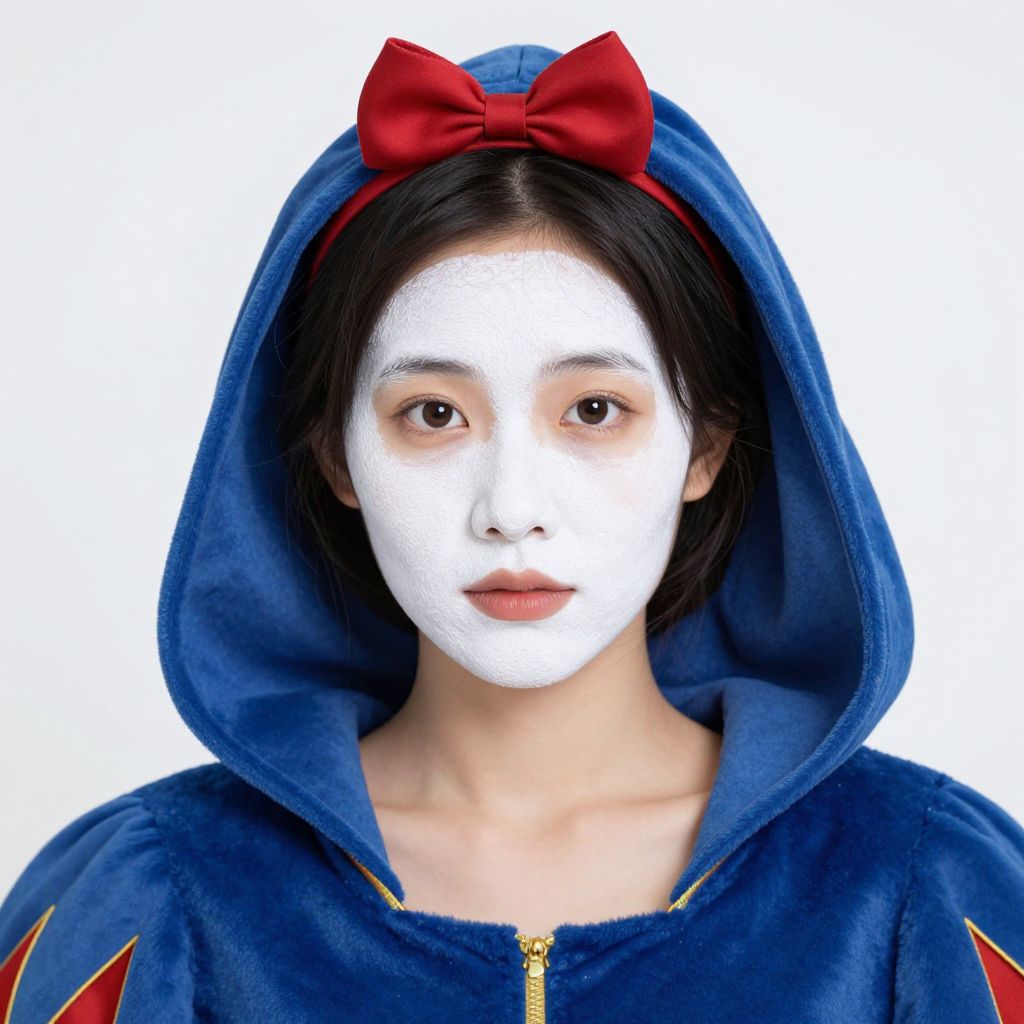 Photograph of an East Asian person with white face paint, wearing a blue Snow White hoodie with red bow, white background.