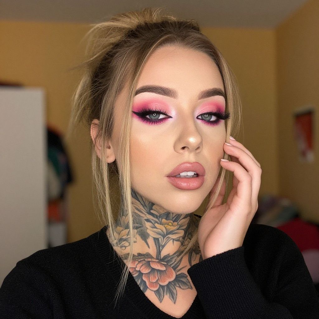 Photograph of a young woman with light skin and blonde hair in a messy bun, wearing dramatic pink and black eyeshadow, thick black eyeliner, and nude lipstick. She has a large, detailed tattoo of orange and green flowers on her neck. Her right hand gently touches her face. She wears a black long-sleeved top. The background is a softly lit, yellow-walled room with a slightly blurred door and a red bed visible on the left. The image has a bright, high-contrast, almost neon-like effect.