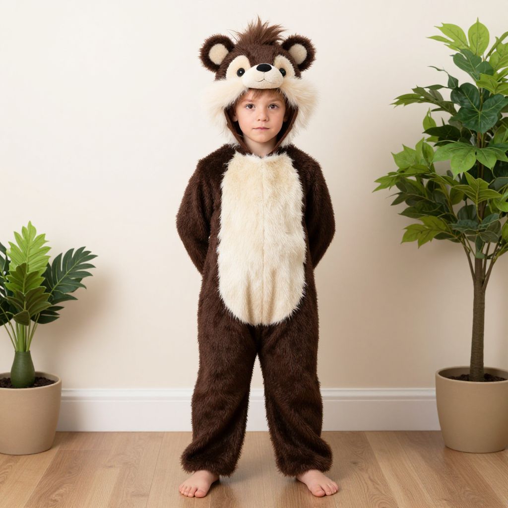Child skunk costume, solo, animal costume, 1boy, male focus, barefoot, bear costume, cosplay, full body, looking at viewer, realistic, kigurumi, arms behind back, standing, plant, potted plant