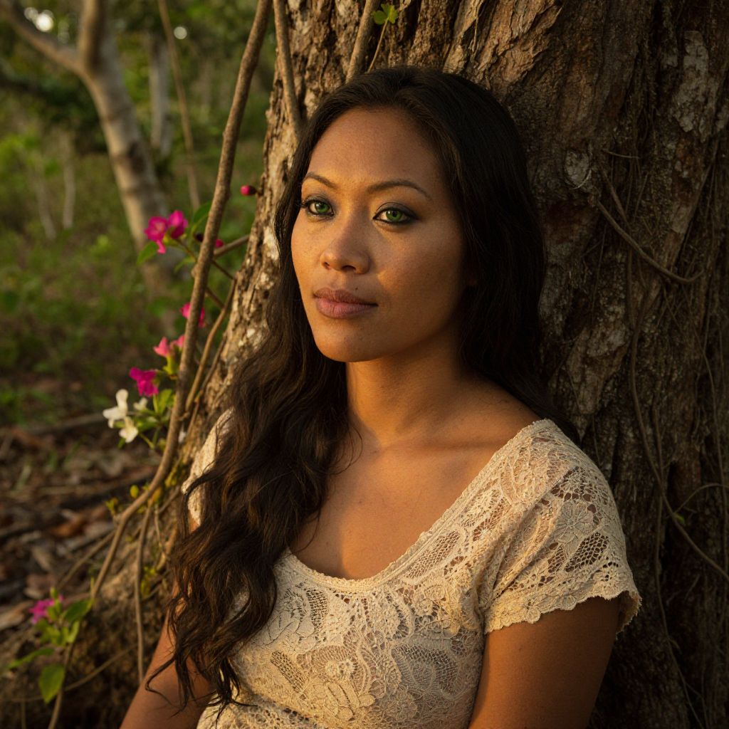 An enigmatic Melanesian woman with porcelain skin and cascading dark hair sits serenely against an ancient tree trunk, her serene green eyes lined with kohl and a subtle smile gracing her lips. Nestled within a lush forest clearing bathed in golden hour light, she wears a vintage lace blouse that catches the soft glow, framing her graceful neck and shoulders. The 'bug's-eye view' camera angle reveals the natural beauty of her skin, showcasing fine textures and imperfections that add depth to her ethereal presence. Surrounded by blooming vines and vibrant flowers, she exudes a sense of serenity as if connecting with ancient nature's wisdom.